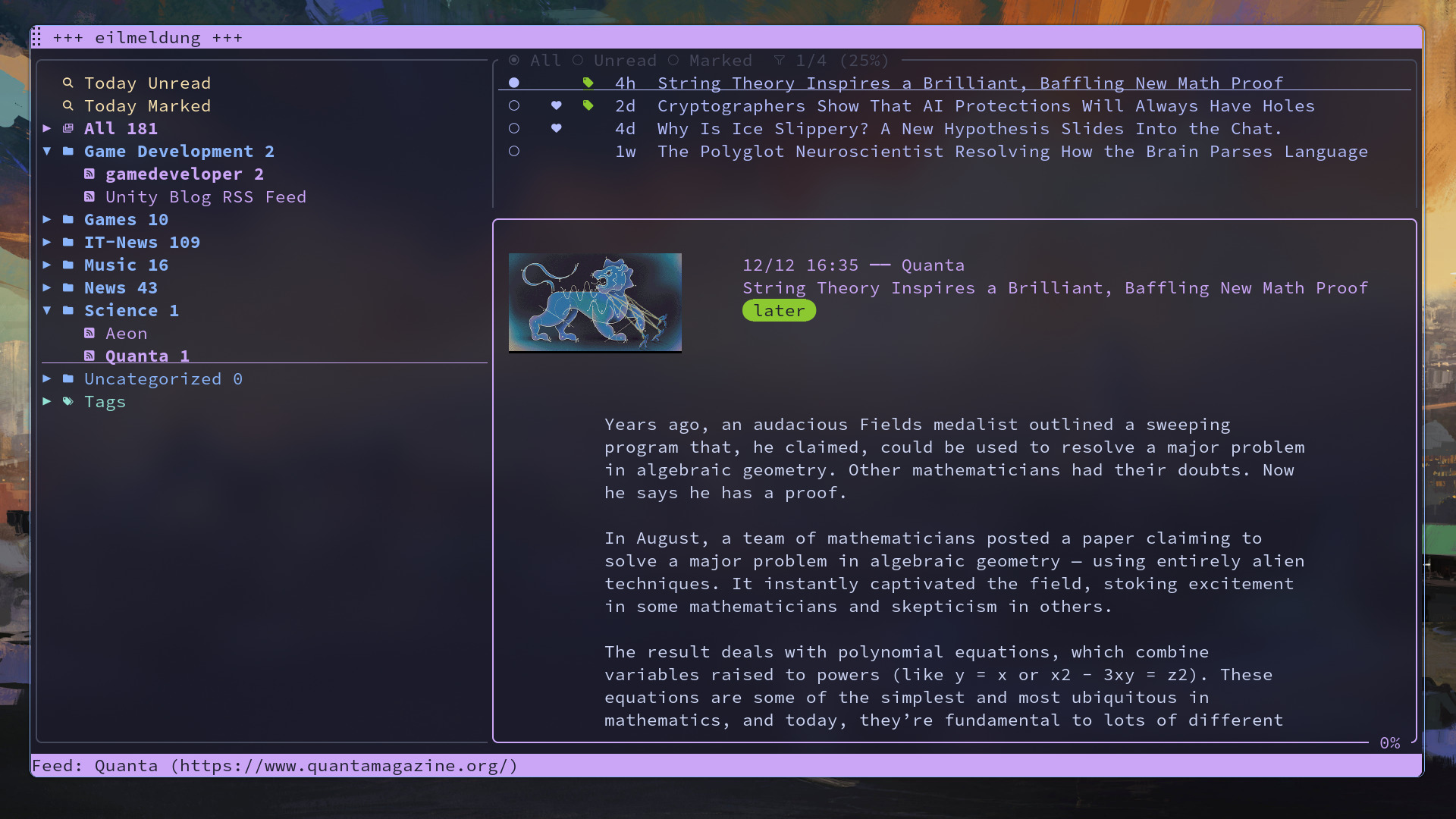 I’ve developed eilmeldung, a TUI RSS reader based on the news_flash library which supports many backends. Happy to hear what you think!