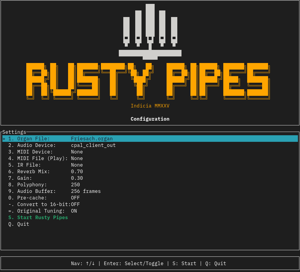 By default, RustyPipes starts in GUI mode using egui, but with the parameter –tui you can run it with Ratatui and the exact same features as the GUI version, including the configuration screen: