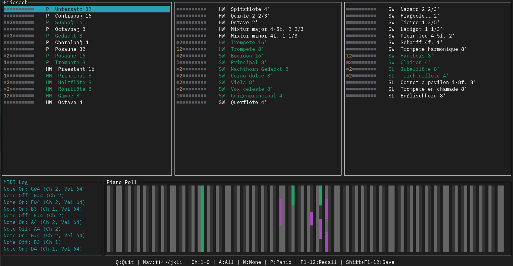 You assign MIDI channels to organ stops with the number keys, and you can save and restore whatever mapping you currently have using the F-keys.